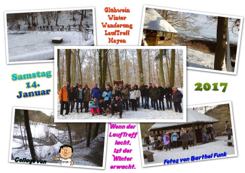 Zum 44. Mal lädt der LaufTreff wieder alle Läufer, Walker, Freunde und Interessierte zur traditionellen Winterwanderung durch den Mayener Wald ein. Start ist am Samstag, dem 12. Januar um 14 Uhr am Echoplatz (nähe Stadion). Für warme Getränke ist gesorgt, Plätzchen- und Kuchenspenden sind willkommen.