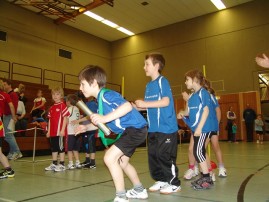 Nach einem durch den Veranstalter organisierten gemeinsamen Aufwärmen aller Wettkampfteilnehmer galt es dann, an vier Stationen zu beweisen, wie fit man in den einzelnen Disziplinen bzw. in der Gesamtheit aller vier Disziplinen ist. So musste jedes Kind je eine Übung aus den Bereichen Wurf, Sprung, Sprint und Ausdauer absolvieren und dabei möglichst gute Ergebnisse für sein Team erzielen.