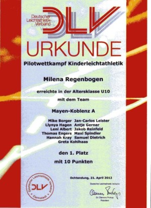 Nina Näckel (W10) und Timo Drzesga (M10) die in ihrer Altersklasse Platz 2 bzw. Platz 3 belegten, Anne Keller (W 8), die als jüngste Läuferin über die 1200 Meter tapfer mit den Älteren mithielt und dafür in Ihrer Altersklasse ebenfalls mit Platz 1 belohnt wurde und schließlich Simon Becker (M10), der zum ersten Mal bei einem derartigen Lauf-Event dabei war und in seiner Altersklasse den 7. Platz belegte.