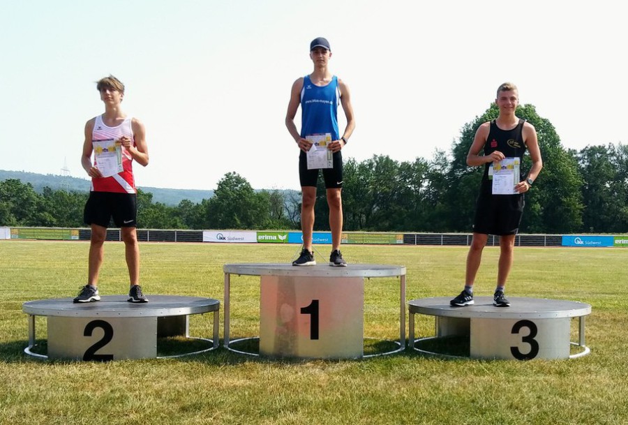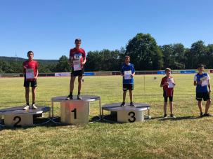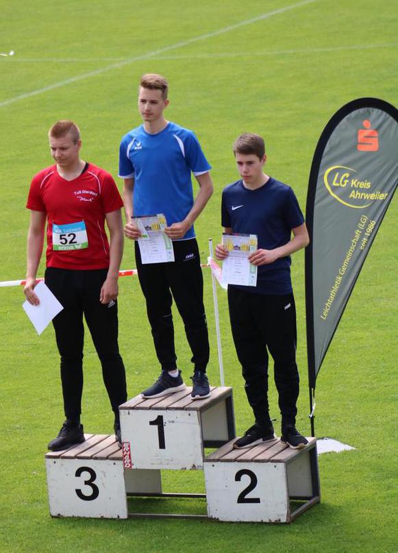 Gleich drei Titel als Bezirksmeister holte sich das Mayener Mehrkampf-Ass Leon Mürtz in der AK der männlichen U18. Sowohl in den beiden Sprungdisziplinen Hoch- (1,74m) und Weitsprung (5,84m) als auch beim Diskuswurf (35,33m) war Mürtz nicht zu schlagen.