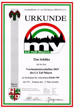 Ein weiterer 4. Platz sprang beim Dreikampf mit denselben Disziplinen für Hannes Emmerich (M11) heraus. Für den Sprint benötigt Emmerich 8,43s, im Weitsprung legte er 3,58m zurück, und der 200-Gramm-Ball landete erst nach einer Weite von 29 Metern. Das machte in der Summe gute 883 Punkte für den äußerst motivierten Mayener Nachwuchsathleten.