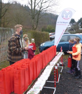 Doch nicht etwa, um ebenfalls eine der roten Tüten zu erhalten, sondern, um den Trainern und Übungsleitern ihrerseits ein kleines Dankeschön für deren ehrenamtliche Tätigkeit im Sinne der jungen Mitglieder des LA TuS Mayen zu überreichen.
