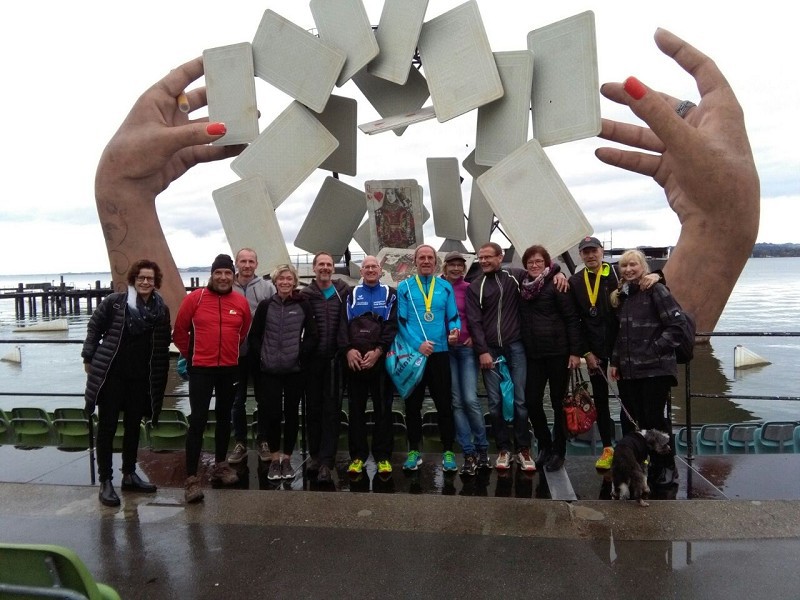 Ein Lauferlebnis besonderer Art gönnten sich die Mitglieder Winfried Hendges (1959), Wolfgang Schmitz (1955), Roland Dietrich (1966), Michael Simon (1958), Thomas Schütz (1964), Stefan Becker (1970), Dagmar Rasbach (1969) und Elisabeth Kaiser (1963). Die geselligen Lauffreunde organisierten nämlich eine Laufreise zum Drei-Länder-Marathon an den Bodensee, wo sie am dortigen Halbmarathon (21, 095 km) teilnahmen und allesamt mit Zeiten unterhalb der 2-Stunden-Marke über die Ziellinie liefen. Mit dieser Tour, die sich über insgesamt vier Tage (6. – 9. Okt.) erstreckte, gingen nicht nur in sportlicher, sondern auch in kultureller und gesellschaftlicher Hinsicht viele neue Eindrücke und Erfahrungen einher, die im kommenden Jahr mit einer ähnlichen Reise zum Marathon „Deutsche Weinstraße“ erweitert werden sollen. Einen ausführlichen Reiseverlaufsbericht findet Ihr weiter unten.