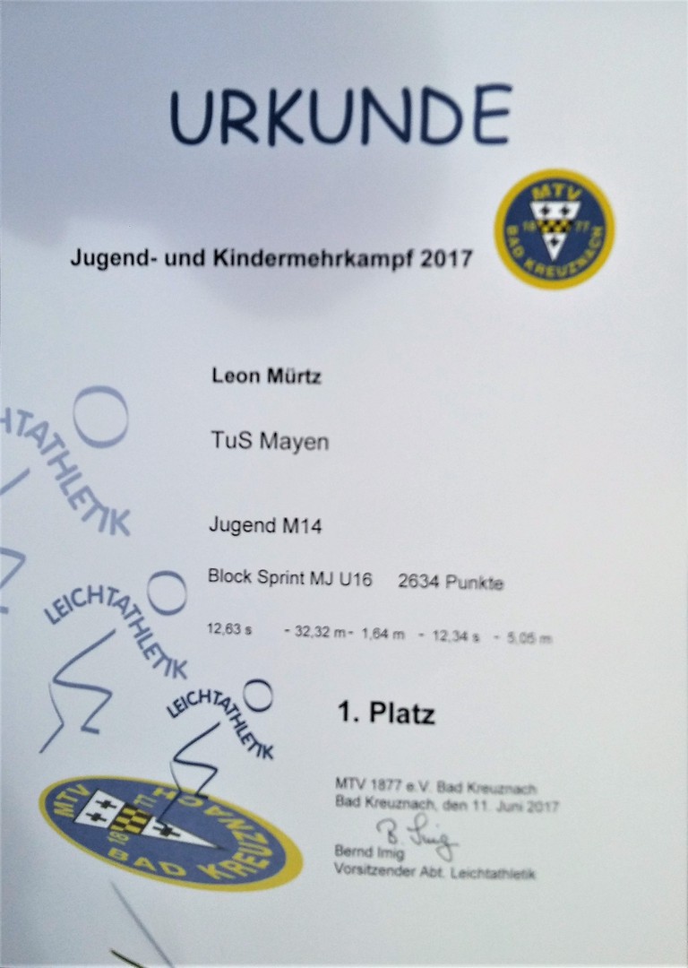 Leider nichts Greifbares (in Form einer Urkunde oder gar einer Medaille) konnten U16-Leichtathlet Leon Mürtz und Trainer Stefan Schon (LA TuS Mayen) von den Deutschen Jugend-meisterschaften aus dem westfälischen Lage mit nach Hause bringen. Denn in den Genuss der Siegerehrung und somit der Aushändigung einer entsprechenden Urkunde, kamen nur die besten acht Athleten des Wettkampfs. Und Medaillen gab es darüber hinaus ohnehin nur für die drei Best-platzierten.