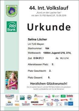 Bei den Bambinis über 444 m liefen Jonas Weinert (1:40 min., 7. M7), Niklas Breitbach (1:50 min., 16. M7), Livia Schon (1:50 min., 11. W7) und Tim Schiller als jüngster Mayener (2:21 min., 16. M7). Die Schüler hatten 1 km zu absolvieren. Erfolgreich waren dabei: Maximilian Meid (4:30 min., 8. M8), Lukas Milles (4:51 min., 18. M8) und Lea Wiesener (5:09 min, 14. W8).