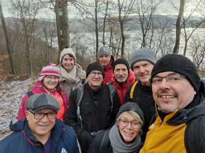 Bei der Anfahrt zum Treffpunkt durch starke Schnee- und Graupelschauer, kamen bei dem ein oder anderen Mitglied jedenfalls leise Zweifel auf, ob eine Wanderung unter diesen Umständen überhaupt Sinn mache. Doch als sich dann immerhin neun winter- und wetterfeste Sportsfreunde mit Mütze, Schal und Schirm am Parkplatz einfanden und nach kurzer Beratung merkten, dass es beim Herumstehen einfach nicht wärmer wurde, wanderten diese schließlich beherzt los. Abgesehen von einem kleineren Graupelschauer auf dem Höhenweg blieb es - zumindest von oben her - trocken.