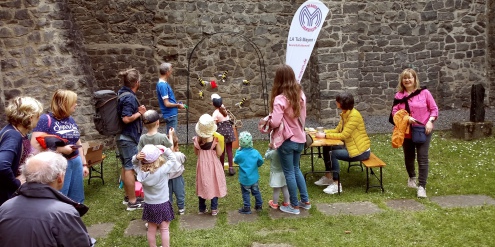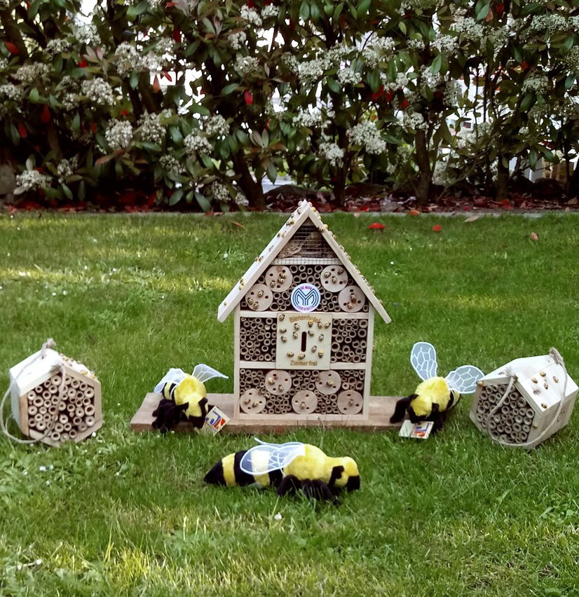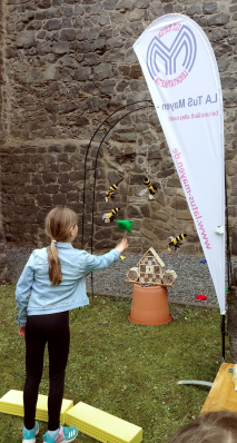An dem Stand im Garten des Mayener Godalming-Hauses am Fuße der Genovea-Burg galt es, ein Bienenhotel nebst seinen Nebengebäuden vor angreifenden Riesen-Wespen aus Plüsch zu verteidigen. Hierzu mussten die jungen Gäste mit Flatterbällen und Wurfsäckchen versuchen, die lästigen Plagegeister zu vertreiben. Jeder, der auch nur eine der angreifenden Wespen mit seien sechs Versuchen getroffen hatte, konnte ein Los in eine Losbox werfen und auf den Gewinn des Bienenhotels oder einer von drei Plüsch-Wespen hoffen. Rund 200 Kinder ließen sich diesen Spaß nicht nehmen und gaben den Wespen richtig was auf die Mütze. Knapp 170 Kinder trafen mindestens eine der gelb-schwarzen Angreiferinnen und nahmen somit an der Verlosung teil, die noch am selben Abend durchgeführt wurde.