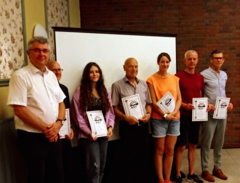 So wurden zunächst die Aktiven Ortrud Meyer, Bryan Bailey, Roland Dietrich, Andreas Nickenig, Günter Simons, Herbert Brück, Heinz Geisbüsch und Adolf Nehren in den Mittelpunkt der Versammlung gestellt und vom Vorsitzenden für ihre herausragenden sportlichen Leistungen und Erfolge im Sportjahr 2022 mit einer Ehrenurkunde und einem kleinen Präsent geehrt.