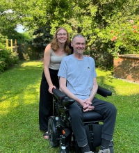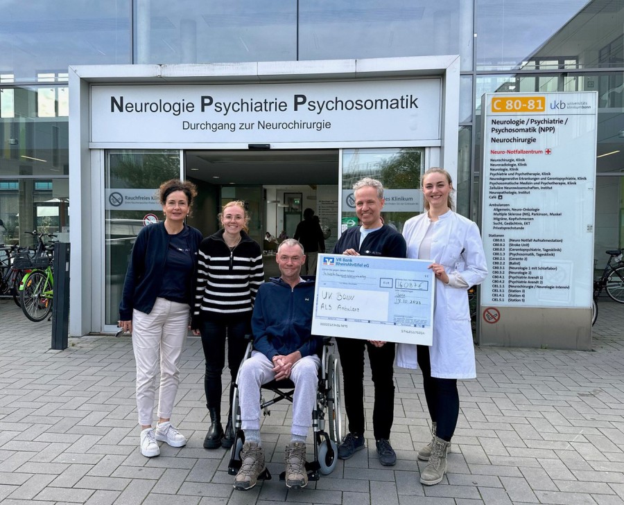 Mit entsprechendem Spendenscheck im Gepäck konnten Johanna Rasbach und ihr seit 2018 an der nicht heilbaren Störung des Nervensystems ALS (Amyotrophe Lateralsklerose) leidende Onkel Elmar „Elli“ Näckel die Reise nach Bonn zur ALS-Ambulanz des Universitätsklinikums antreten.