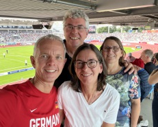 Unser Vorsitzender Martin Jüngermann mit seiner Frau Claudia sowie Birgit und Andreas Nickenig hatten ihren Fokus nach Besuchen beim Triathlon, Speedklettern und 3x3 Basketball natürlich bei der Leichtathletik.