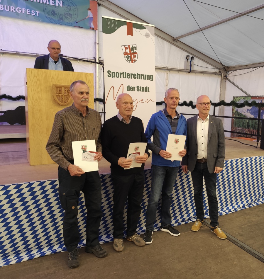 Im Rahmen des Mayener Stein- und Burgenfestes wurde traditionell die Ehrung verdienter Sportler durch die Stadtverwaltung durchgeführt. Im voll besetzten Festzelt würdigte der Oberbürgermeister Dirk Meid auch die Leistungen von drei Leichtathleten des LA TuS Mayen für ihre Ergebnisse in den vergangenen Monaten. Andreas Nickenig, der sich aktuell von einer Achillessehnenoperation erholt, gewann im Vorjahr mit dem deutschen Team der Altersklasse M55 im Crosslauf die Silbermedaille bei den Masters Weltmeisterschaften in Göteborg. Günter Simons wurde für seinen Titelgewinn bei den Deutschen Senioren-Hallenmeisterschaften in Frankfurt über 400 Meter in der Klasse M85 geehrt. Heinz Geisbüsch erreichte bei diesen Meisterschaften ebenfalls über 400 Meter den 4. Platz in der Klasse M75. Die Ehrung ist für die drei Sportler ein Anreiz, auch zukünftig die Stadt Mayen und ihren Leichtathletikverein erfolgreich bei nationalen und internationalen Wettkämpfen zu vertreten.